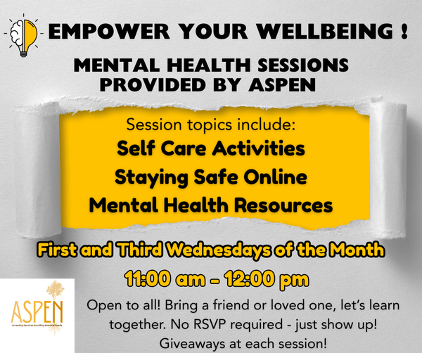Empower your wellbeing by attending one of A.S.P.E.N.'s mental health sessions! Topics include: staying safe online, mental health resources, and self-care activities.