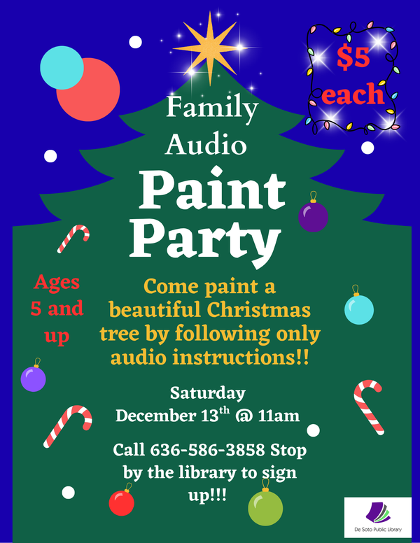 - Join us at the library on Saturday, Dec. 13th for a holiday themed paint party! Painters will be challenged to make a dazzling Christmas tree with audio intructions only! Call the library at 636-586-3858 to sign up!